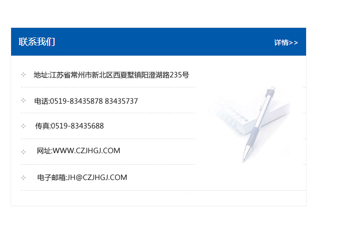 地址:常州市新北區友邦商務大廈1幢16、17層  電話:0519-85101652  傳真:0519-85112595  郵編:213022  網址:www_cz-jiayue_cn.makarmalar.com  郵箱:xiajifengaa@163.com